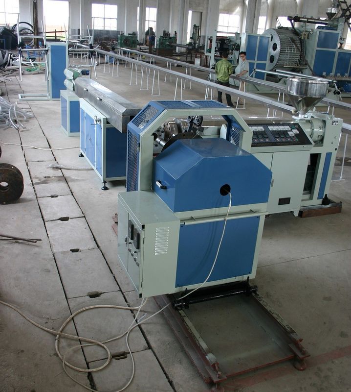 Pvc-lijn van de de pijpuitdrijving van de staaldraad omvat de versterkte hoofdzakelijk extruder, staaldraad die machine, water bespuitende tank, afstand-van machine en spoel etc. rollen.