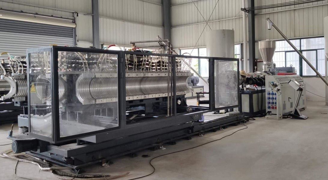 Extruder: De hoge snelheid en de efficiency de enige schroefextruder speciaal wordt ontworpen voor drijven PE materiaal uit. Gegroeft die vat, met de lagere lawaaiventilator, de hoge snelheid en het harde toestelreductiemiddel wordt uitgerust. De binnen en buitenlagen van de golfpijp worden onafhankelijk gevoed materiaal door twee extruders. Het kan de binnen en buitenlagen maken verschillende materiaal en waarborghoog rendementuitdrijving veroorzaken.