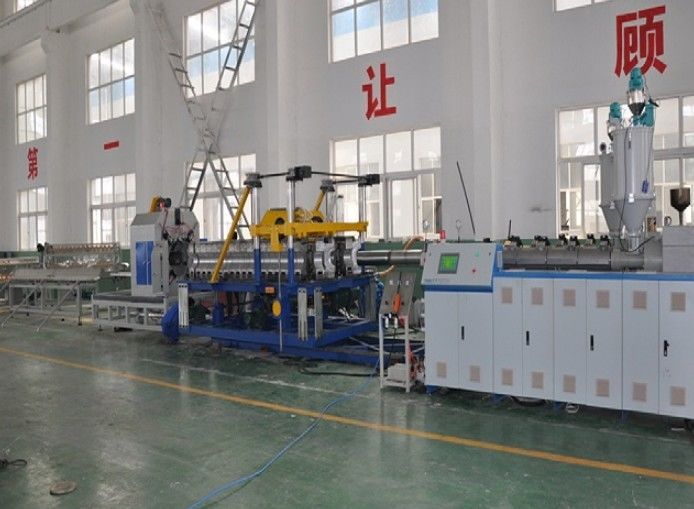 2. Deze PE pijplijn wordt samengesteld door materiële Enige de schroefextruder van charger+ + pijpvorm + vacuümkaliberbepalingstank + bespuitende koeltank x 2sets + rupsband drie afstand-van machine + geen-stofcutter+ stapelaar.