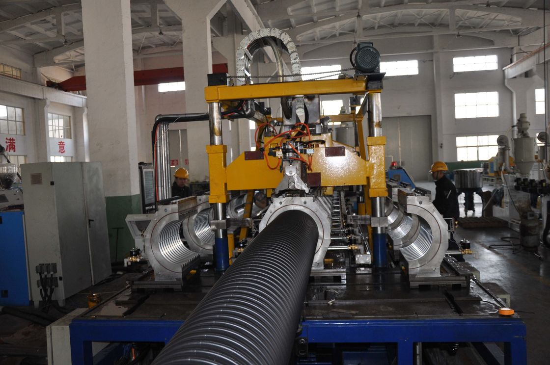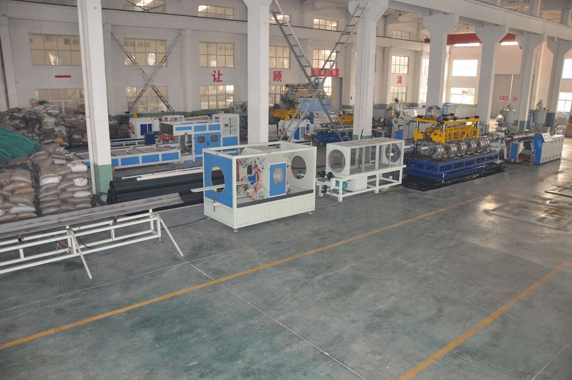 De grondstof + bijkomende → die de vacuüm het voeden → droger van de machine→ vultrechter → mengen enige schroefextruder voor materiële/dubbele de schroefextruder van PE/PP voor de matrijs van de de pijpuitdrijving van pvc material→ + plooide pijp zich vormt die→ vormt machine→ afstand van machine→ spoel/rolmachine
