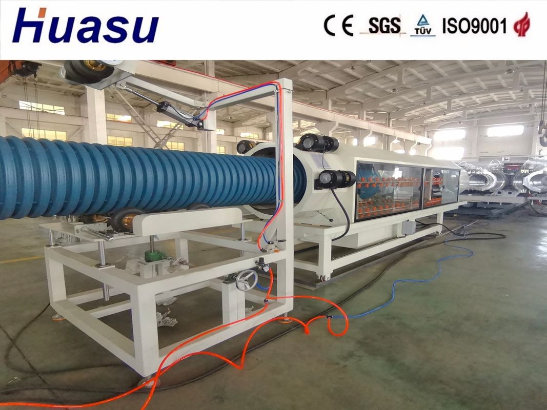De dubbele muur golflijnis de 3e generatie van het verbeterde product van Shandong Huasu. De output van de extruder en de productiesnelheid van de pijp worden sterk verhoogd met 20-40% vergeleken met het vorige product.